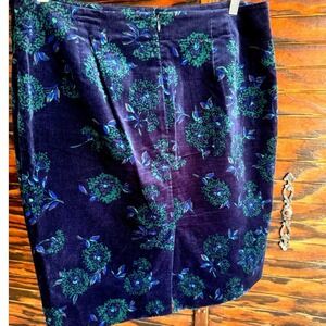 Ann Taylor Factory blue and green velvet feel patterned floral skirt in women's size 12. This stunning skirt features a rich, textured velvet style/feel fabric with an elegant abstract pattern that catches the light beautifully. Designed with a knee-length (24") hemline, it offers a sophisticated and flattering silhouette perfect for work, parties, or special occasions.