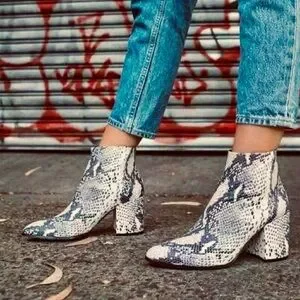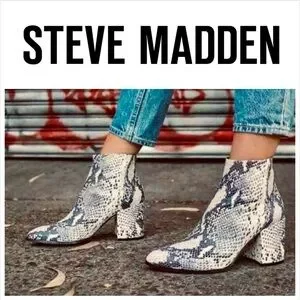 Madden Girl sz 8.5M, Boots Snake print embossed heeled point toe chunky booties, cream/tan/black/brown/gray, 2.75โ heel, man-made upper and sock fabric lining, zippered EUC. A Steve Madden brand design for fashion-conscious women!