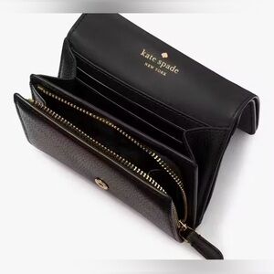 Black pebble leather compact wallet with front snap closure. Interior features bill compartment, 5 card slots, L zip compartment.