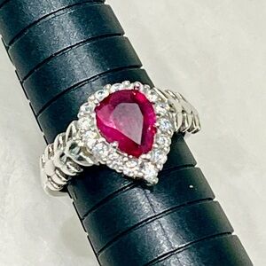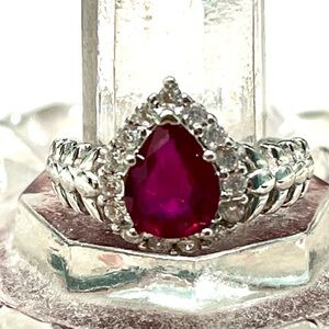 This stunning ring features a vibrant heart shaped 1.75 ct ruby, complemented by a halo of cz. The band is beautifully designed with generous silver. The 925 sterling silver is plated with white gold. The high quality of the ruby and intricate design make it a must-have accessory.
