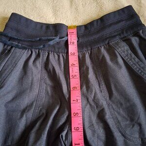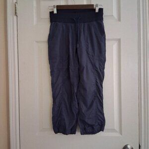 The North Face Women's Size XS Aphrodite 2.0 Capri Pants in blue (denim blue). These pull-on pants feature a rib-knit waistband with a drawstring, two front side pockets, and an invisible zip pocket inside the right-hand pocket. The straight-leg style includes shirring on the legs for style and comfort. Made from a moisture-wicking fabric with UPF 40+ sun protection.