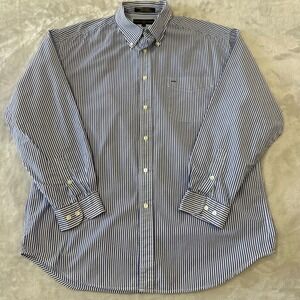 Keywords: Tommy Hilfiger, Golf shirt, Button down shirt, Striped shirt, Long sleeve, Menswear, Casual shirt, Dress shirt, Blue and white, Preppy style, Golf attire, Mens fashion, Size large, L/G