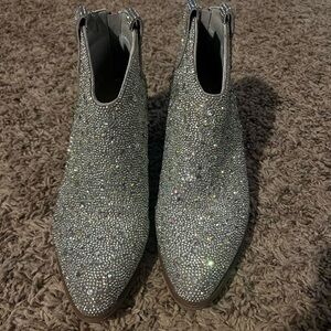Dazzling silver booties with sparkling embellishments. Chic and stylish for any occasion.