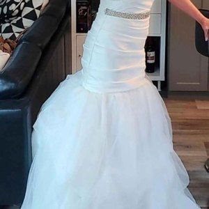 Size 6 to 8, bustled, with a long train when undone. I am 5’ 3” and wore 6” boots (pictured below for reference), and the hem was still quite generous. Included is the $120 jeweled sash. Tulle skirt. And the most beautiful Mikado fabric. Exclusively from David's Bridal.