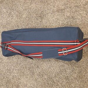 Very cute Ariat Tall Boot bag! This is similar to the Ariat Team Tall Boot bag, but it is an older print. Dark Navy Blue with red accents on the outside of the bag. Inside features a stylish bit and bridle pattern. Full length double zippers and a separate space for each boot so they don't rub. Outside has a small pocket that velcros closed. Used, and has some expected stains/smells from being at the barn and horse shows, but overall good condition.