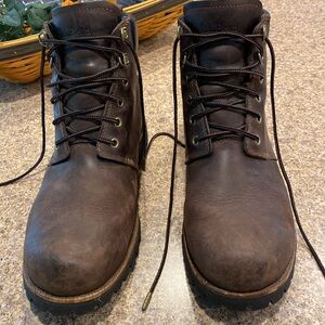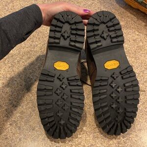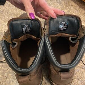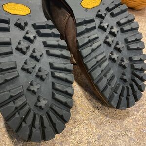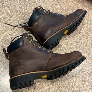Just Reduced. L.L. Bean Work Boots 10 Wide Leather with Vibram Soles. PLEASE NOTE: THEY ARE 10 WIDE. LL Bean Item # 301050. These are mostly brown with I believe black trim and soles. I have a hard time with colors so I could be wrong about the colors. These are in used condition; they aren’t new and have been used and have some age to them and they show all over wear including but not limited to scratches, scuffs, and imperfections to leather and the rest of the boots and and may have other imperfections. They have been sanitized but have some dirt and lint etc on them. Any measurements are rough measurements and colors may be off because of lighting.