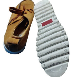 Really nice moccasin detail suede shoes in a bright tan finish with white details. The is something like a sneaker with its rubber sole yet something like a boat shoe with the style and shape. Quite nice. Order them today size 9.5 men's.