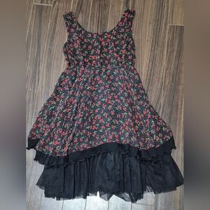 This Traffic People Silk Cherry Print Dress (XS) captures playful retro charm with a feminine twist. Made from 100% silk with a soft black tulle underlayer, it features a fitted bodice, subtle shirring, and a flouncy tiered hemline that moves beautifully. The cherry print adds a whimsical pop against the sheer black overlay — perfect for both daytime picnics and evenings out.