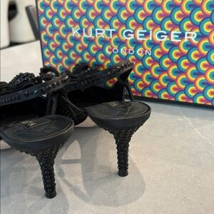 Chic black heels with intricate beading. Features elegant bow detail. Perfect for stylish occasions. Size 8.5