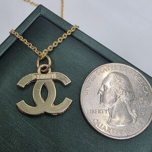Sophisticated CHANEL necklace with iconic gold logo. Perfect for any occasion. on a 18 inch gold over silver offbrand chain.