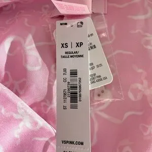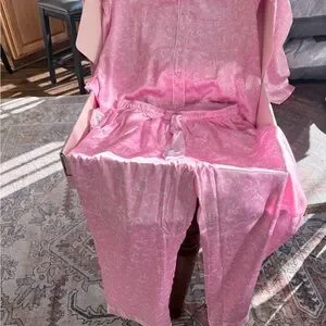 Elegant pink pajama set with intricate patterns. Heart detail on pocket. Perfect for cozy nights.