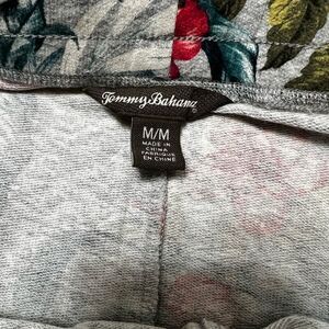 Tommy Bahama soft cotton jersey floral printed skirt. Gray background with colorful rose flowers with green palm leaves. Drawstring at the waist, not lined Flowey and fun.