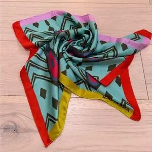 The striking combination of teal, red, and yellow adds a pop of color to any outfit. Looks cute as a hairband, on your bag, around your neck too. It’s nice, just downsizing my closet.