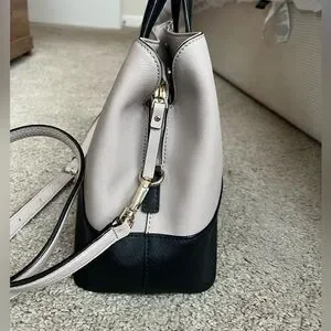 Chic Kate Spade satchel with a black and beige/purple-ish design. Never used. Small marks on bottom of bag as shown in pictures. Includes detachable cross body strap and tassle keychain.