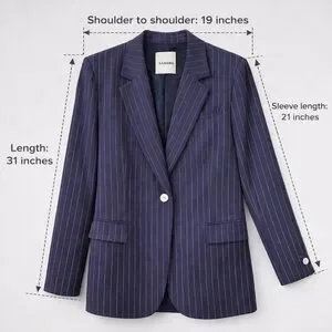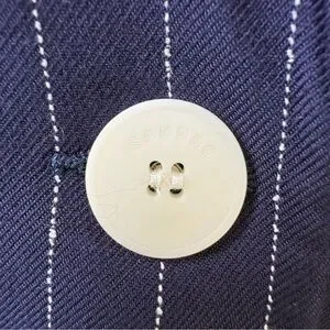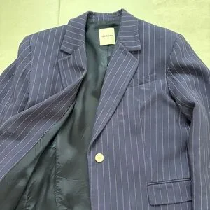 SANDRO Paris women’s blazer in classic navy blue with fine pinstripes.