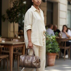 Beautiful and classic Fendi Zucca Boston bag crafted in Fendi’s iconic crystal-coated canvas with smooth leather trim. This timeless duffle-style silhouette is roomy, structured, and perfect for everyday carry, travel, or as a statement vintage luxury piece.