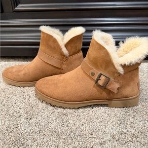 Warm suede boots with plush lining. Features a stylish buckle detail. Ideal for cold weather.
