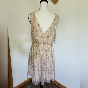 NWT Southern Fried Chics Boutique Elegant Sequin Embellished Dress, new with tags, size large, pit to pit 17 inches, length 37 inches, sleeveless, fit and flare, beige with iridescent sequins throughout, lined with tulle overlay, 100% polyester, would look for any eras tour celebration!