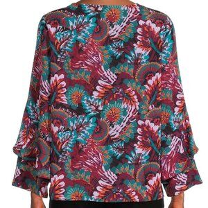New with tag The Pioneer V neck Long Sleeve Floral Print, Relaxed Fit Woman Cascade Caplet Ruffle Blouse in Olive & Wine