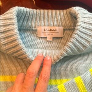 Chic light blue sweater featuring bold neon yellow stripes. Ideal for a trendy outfit. Size small. Like new condition. Smoke free home