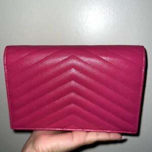 Chic fuchsia clutch with quilted design. Features iconic YSL logo in gold. Perfect for evening outings.