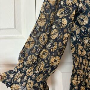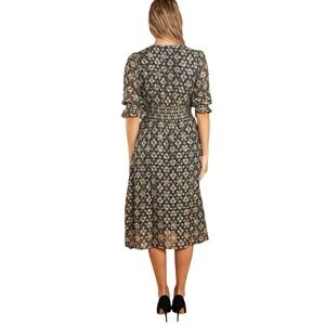 The Tenea Midi Dress has gold metallic dots layered on a tie dye print, stretchy smocked waist, flattering faux wrap, and semi-sheer puff sleeves.