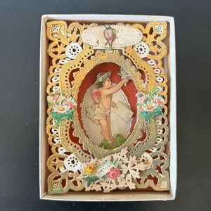 From my personal collection, an Antique Valentine in a Box, late 19th Century. Listing this under Art because it truly is! Quite rare nowadays, it was the fashion in the late 1800’s to hand craft these intricately embellished 3D Valentines, lovingly made with paper, paper lace, cardboard and die-cut scraps. The cover says “A Token of Love” and has a Victorian Style design with two Love Birds, and the inside says “I’m Thine”, with an angel holding a card and bouquet of posies for his lover. In amazingly great shape for its age. No cuts or breaks in the paper, no holes in the box. Just a tiny bit of discoloration here and there, to be expected. What a unique treasure to give your sweetheart this Valentine’s Day ❤️