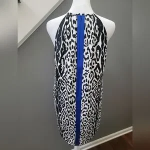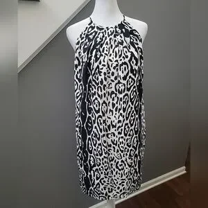 The JAY GODFREY Diddley Dress in Animal Print is a stylish and versatile piece perfect for various occasions. Made from 100% silk, this sleeveless dress features a zip closure and is adorned with a white and black animal print pattern. The midi length and drop waist silhouette give it a trendy and unique look, making it ideal for parties, cocktails, casual outings, or formal events. With its size 2 fit and regular size type, this dress is a must-have for any fashion-forward woman's wardrobe. This is NWOT!
