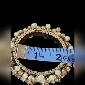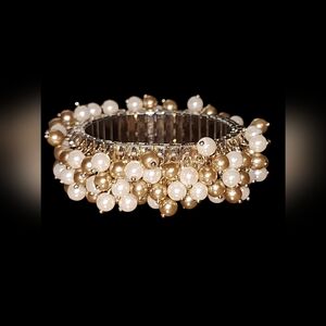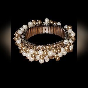 This Ann Taylor bracelet is a vintage-style stretch bracelet featuring clusters of faux pearls in alternating shades of white and gold. The pearls are securely attached to a flexible base, allowing the bracelet to comfortably expand and fit various wrist sizes. The design is highly textured, with the dangling pearls creating a dynamic and eye-catching appearance. Measuring approximately 2 inches in width, it has a bold, statement-making quality.