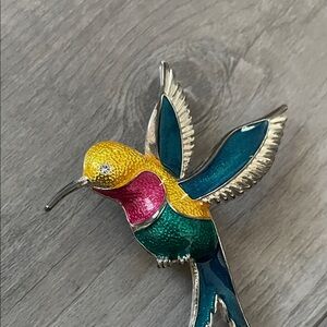 Vibrant hummingbird brooch by Artisan. Features yellow, pink, and green hues. Perfect for adding a splash of color.