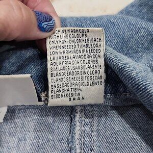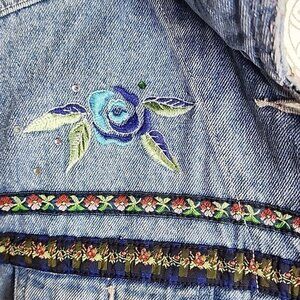 This Bill Blass Jeans vest is a unique addition to your wardrobe. The denim outer shell is adorned with embroidered floral accents, rhinestone buttons, and features a collared neckline and pockets. This vintage, sleeveless vest is perfect for travel or casual occasions and has a button closure. The medium size fits regularly, and the vest is machine washable. The blue color and denim fabric type make it suitable for all seasons - winter, summer, fall, and spring.
