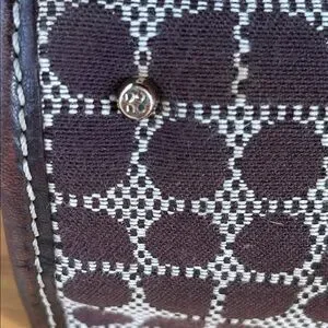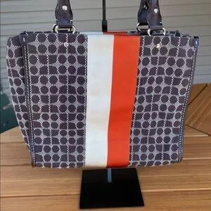 Chic tote with a bold geometric design. Features brown, orange, and cream colors. Ideal for daily wear.This is a vintage bag. Does have some wear and yellowing on white stripes. It has been professional cleaned. It will be a great bag for your collection!