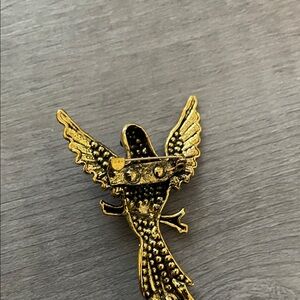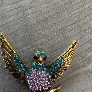 Charming bird brooch with pink and gold accents. Features intricate detailing and sparkling stones. Perfect for any ensemble.