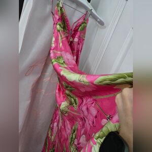 Pink floral pattern, adjustable straps, split front, like new condition, gold-tone ring detail at front