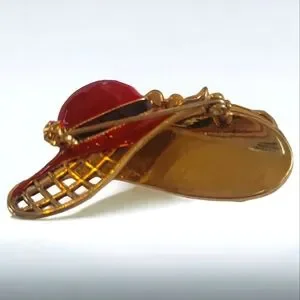 This pin sparkles with its beautiful gold tone and eye-catching red enamel design.