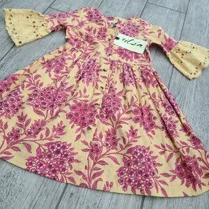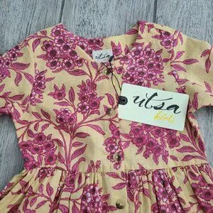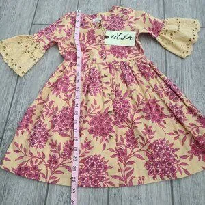 Adorable Utsa Kids dress featuring a yellow base with pink floral print, button front bodice, gathered waist, and eyelet bell sleeves for a charming boho-inspired look in toddler size 2Y.