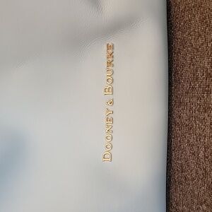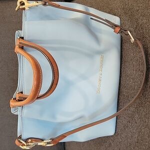 Chic Dooney & Bourke sky blue tote with tan leather handles. Perfect for daily elegance. Spacious and stylish.