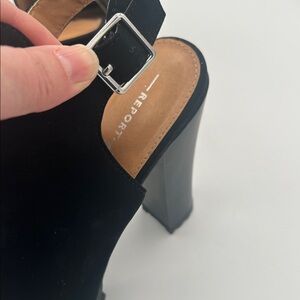 Report Lilian black chunky heeled slingback peep toe booties.