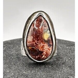 This Mexican Fire Opal sterling silver ring, size 5.75, features a beautiful natural gemstone with a fiery red-orange hue. The artisan craftsmanship adds a unique touch to this piece of fine jewelry, making it a perfect accessory for those who appreciate nature-themed designs. The combination of the fiery opal and sterling silver creates a stunning contrast that is sure to make a statement.