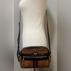 Gucci Ophidia Sherry Crossbody Bag – Brown Suede & Patent Leather w/ Web Stripe