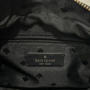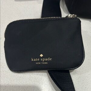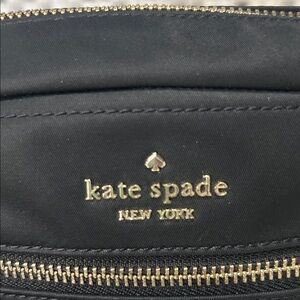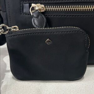 Chic black nylon crossbody bag by Kate Spade. Features sleek gold zipper and logo detailing with a coin purse.