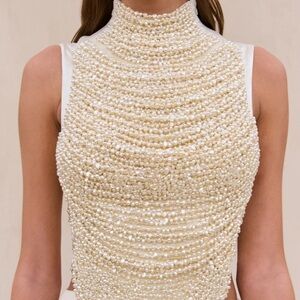 Stunning sleeveless top adorned with intricate pearl embellishments. Perfect for a chic and sophisticated look.