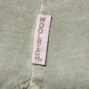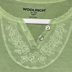 WOOLRICH womens green short sleeve henley t shirt size L. Features a notched neckline with two button closure and delicate embroidered detailing around the neckline. The hemline has a unique stepped design with reinforced side seams.