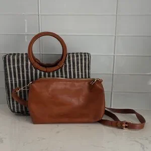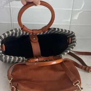 Antik Kraft Black and White Striped Shoulder Bag with Brown Handles