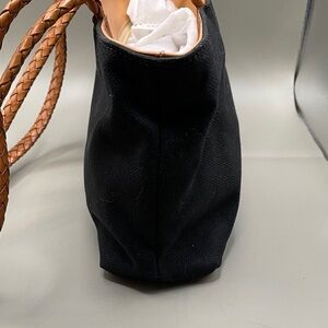 Brahmin Navy Fabric Shoulder Bag and tan braided handles. Ideal for daily use. Interior is suede with 1 Zip pocket. Bag closes with zipper