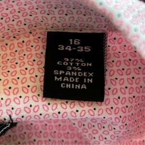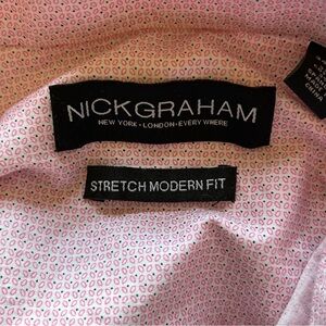 Nick Graham Men's Pink Print Dress Shirt Stretch Modern Fit Size 16 34-35. Excellent condition, extra buttons intact. Cotton, spandex. Machine washable. Check out my other listings. Bundle up to 5 pounds from my closet for one shipping fee and an automatic discount.