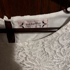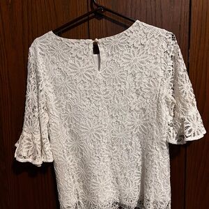 Beautiful and feminine white lace blouse from Nanette Lepore. Features floral lace overlay, scalloped hem, and flutter sleeves for a delicate, romantic look. Fully lined with a button keyhole closure at the back. Perfect for pairing with jeans, skirts, or dress pants for an effortlessly chic outfit.