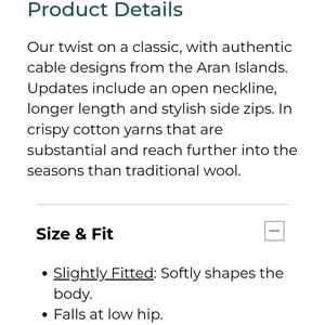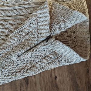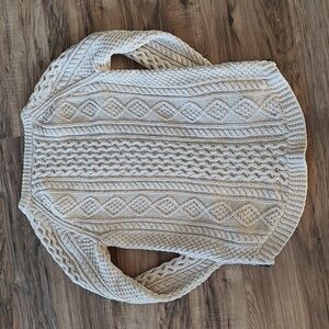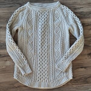Excellent condition, no rips, stains, or holes. Ivory/cream colored longer length cable knit sweater. Has more of a boat neck than a crew neck. Side zippers on the bottom. Really heavy, well-made, beautiful sweater. Size is extra small, but definitely fits big. I wear between a small and medium and it fits me. Smoke free home.