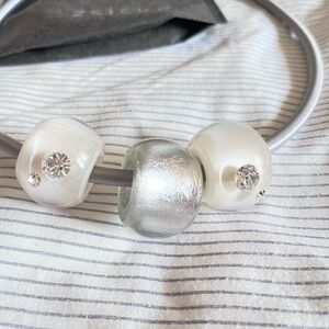 Beautiful piece with 2 white beads and 1 silver bead featuring 4 crystals on each white beads. Magnetic closure for easy wear. All strung on a gorgeous gray cord rope. My daughter described this as Maximus minimalist due to the size of the beads, which are approximately 1 inch by .75 inch. Approximately 23 inches long.
