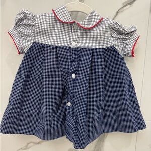 Charming blue and white checkered dress featuring red accents and floral embroidery. Perfect for a stylish look.